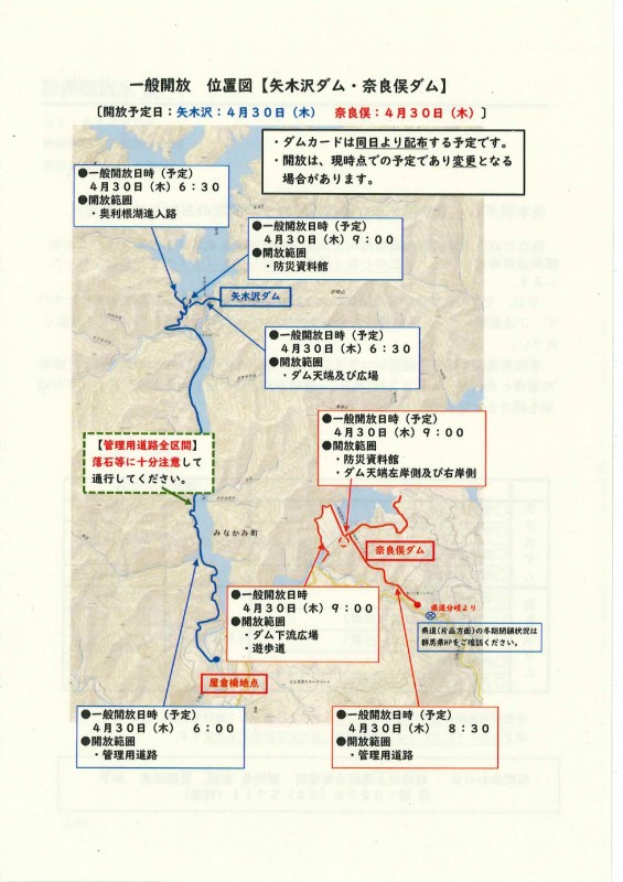 トップページ > 新着情報一覧 > 矢木沢ダム・奈良俣ダムの管理用道路等の開放のお知らせ(予定) 2026/04/15(水) お知らせ 矢木沢ダム・奈良俣ダムの管理用道路等の開放のお知らせ(予定) <<戻る - Powered by PHP工房 -